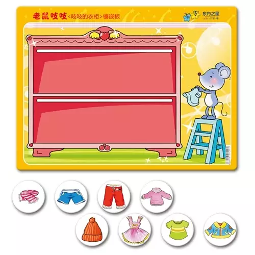 在 “吱吱的衣柜”活动中,让孩子根据服装的某种属性进行归类。如:找出所有的上衣(裤子、短袖、天冷穿的、天热穿的)卡片。